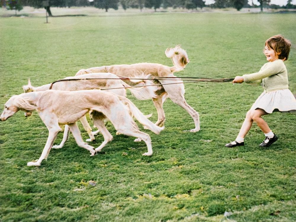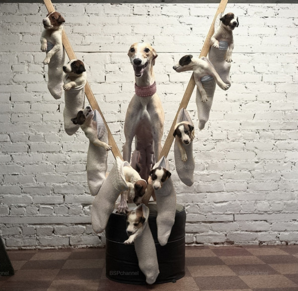 Борзая со щенками, висящими в носках. Нью-Йорк, 1959 год.