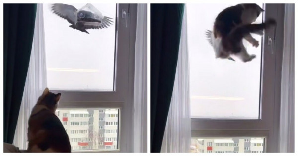 Девушка повесила оконную кормушку для птиц. Спустя некоторое время она обнаружила, что из кормушки получился неплохой тренажёр для кота.