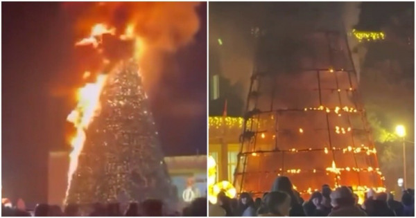Местные телеканалы сообщают, что причиной возникновения пожара стало короткое замыкание. Очевидцы распространяют в социальных сетях кадры с пылающей елкой.