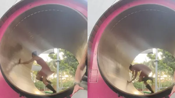 Девушка решила испытать гигантское беговое колесо, похожее на те, что используют для грызунов. Сначала казалось просто, но быстро стало ясно, что удержаться не так легко.