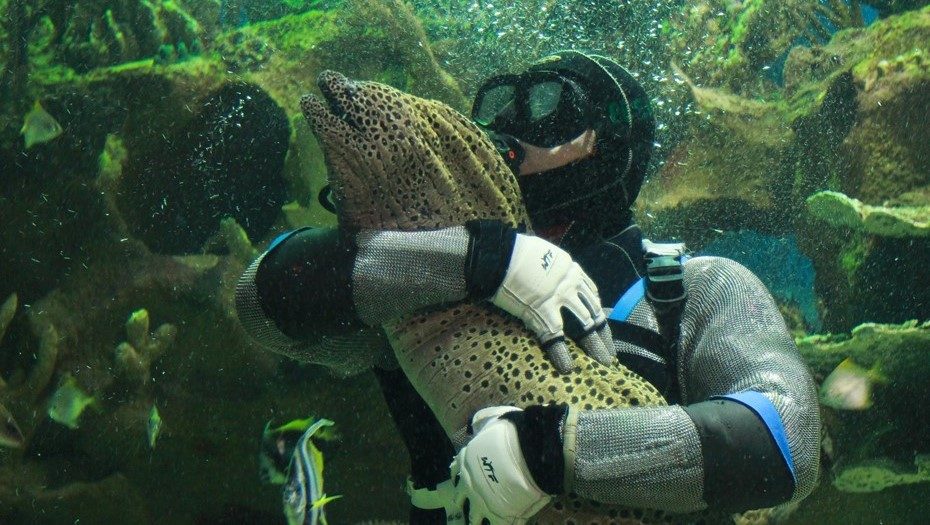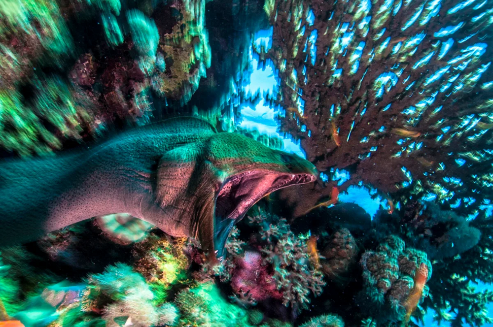 Мурена - это 3 метра и 30-50 кило ненависти ко всему вокруг. Гигантский рыбозмей - самый толстенький из всех муреновых. Но не ведитесь на грузные габариты. Эта махина в своей неумолимой ярости молниеносна, а в ловкости не уступает кошкам.