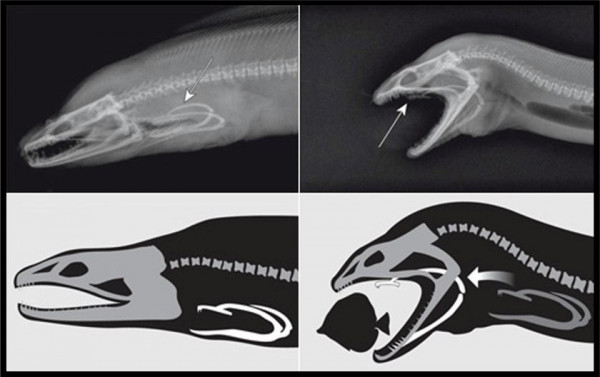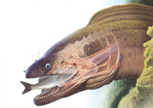 Обычно лучепёрые рыбы (к коим относится и мурена) свою добычу всасывают. Для того, чтобы пылесосить океан, они резко разевают рот. Объём увеличивается, давление снижается, и несчастная жертва вместе с водой устремляется прямо в пасть. Но мурены не ищут легких путей. Эти хищники сидят в засаде среди скал и кораллов, поэтому расширение ротовой полости, необходимое для создания вышеописанного смертельного аттракциона, ограничено узким пространством. А кушать-то хочется! Поэтому мурены выбрали более эффективный и эффектный способ. У них появились вторые челюсти.
