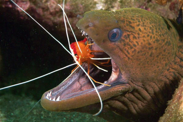 Несмотря на буйный нрав и стеклянный взгляд безжалостного убийцы, даже такой персонаж умудрился обзавестись друзьями! Представляю вашему вниманию средиземноморских креветок! Дружба эта, правда, по расчету. Креветка обитает на теле рыбы, очищая её от паразитов и остатков пищи. Взамен малявка получает убежище и надежную защиту в лице одного из страшнейших хищников океана. Вот это крыша!