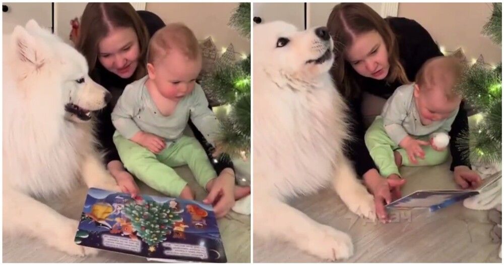 Женщина использует вой своего пса в качестве звукового сопровождения во время чтения новогодних рассказов. Питомец хорошо изображает вьюгу.