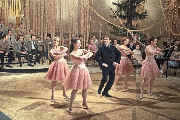 Певец Эдуард Хиль и танцевальная группа "Алые паруса" выступают на Центральном телевидении в "Голубом огоньке", 1970 год.
