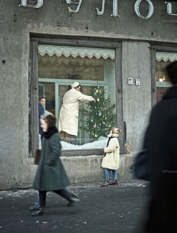 Девочка наблюдает, как украшают витрину булочной к Новому году, 1958 год.