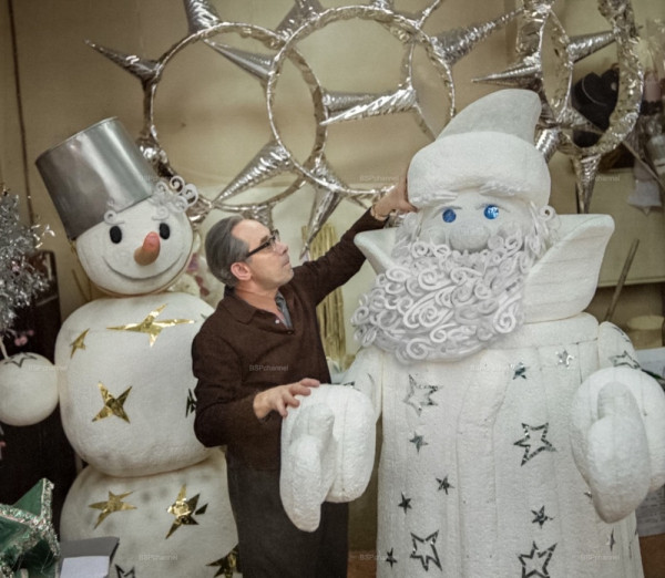 Сотрудник декоративно-художественного комбината универмага "Детский мир", макетчик Н. Шахнович с готовым новогодним оформлением для торговых залов. Москва, 1972 год.