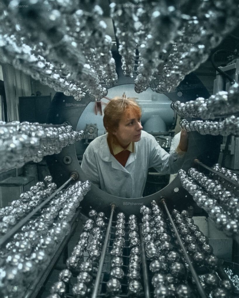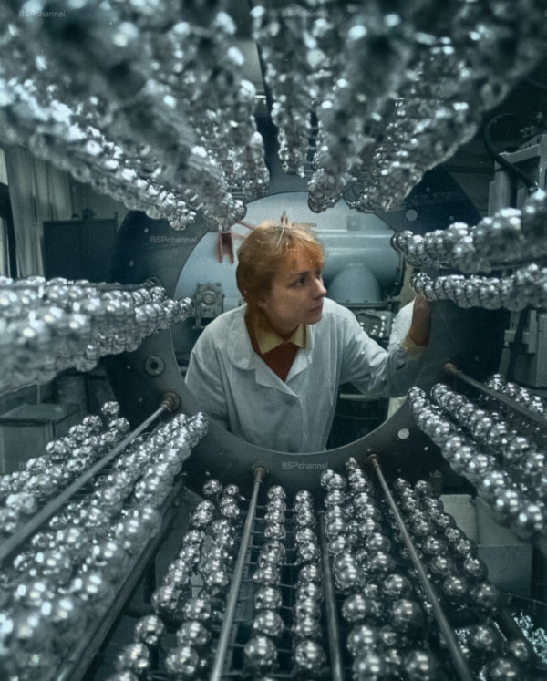 Мастер фабрики "Ёлочные украшения" объединения "Игрушка" С.В. Гридюшко проверяет качество ёлочных игрушек после глазурования, 1986 год.