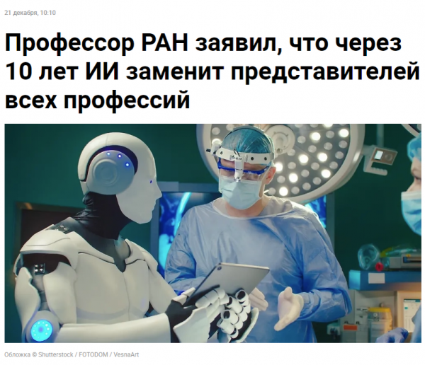Недавно профессор РАН, доктор физико-математических наук Юрий Вильтизер на радио "Комсомольская правда", рассуждая о будущем искусственного интеллекта, заявил, что через 10 лет ИИ сможет заменить любую офисную профессию. Однако профессора это не пугает. Он сравнивает это с заменой землекопов на экскаватор. Землекопы, освоившие управление экскаватором, к тому же выиграли в этой ситуации.Давайте узнаем, пугает ли такая замена обычных людей?