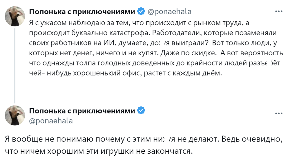 В Х обсудили, что творится с рынком труда, на что способны люди, которых ИИ лишил работы, ну и куда мы вообще катимся.