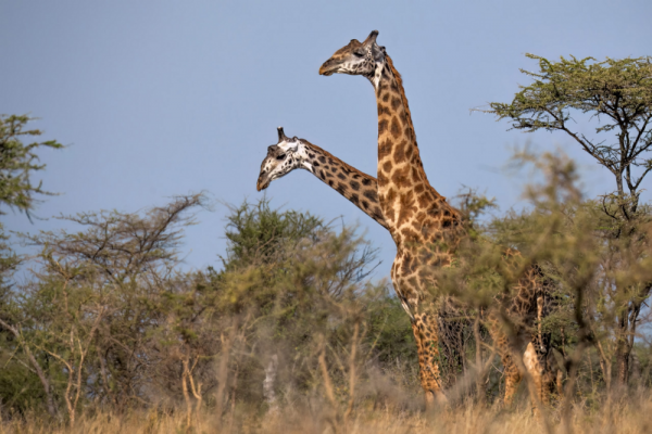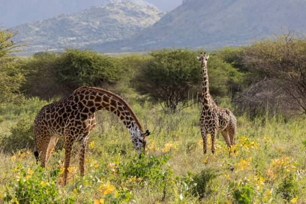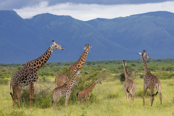 Мне посчастливилось своими глазами видеть потрясающую сцену. Стадо жирафов шло в сторону гор, будто намереваясь подниматься выше. Но что-то постоянно их задерживало. Они останавливались, оглядывались, ждали. Крупный тёмный бык терпеливо пас молодняк. Самки держались возле молодой матери. И вскоре стало ясно почему. Самая маленькая, крошечная телочка, едва могла идти. Похоже, хищники уже успели добраться до неё. Нижняя часть ног была в ранах, опухших и воспалённых. Двигаться ей было мучительно больно, и всё же она пыталась ковылять за стадом. Но поразило меня другое: как стадо держалось вокруг неё, не позволяя отстать. Более крупные особи прикрывали малышку с разных сторон, а мать всё время останавливалась, позволяя телёнку прижаться к боку или попить молока. Не уверена, что телёнок выжил. Такова жизнь в дикой природе. Но их поведение, эта очевидная забота о раненом детёныше, стало одним из самых сильных наблюдений в Мкомази.