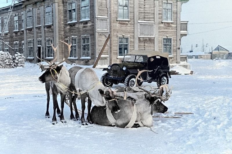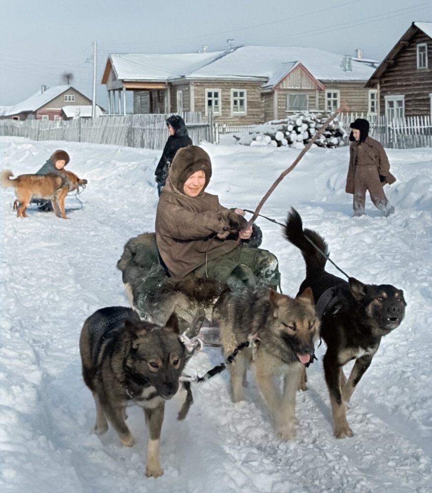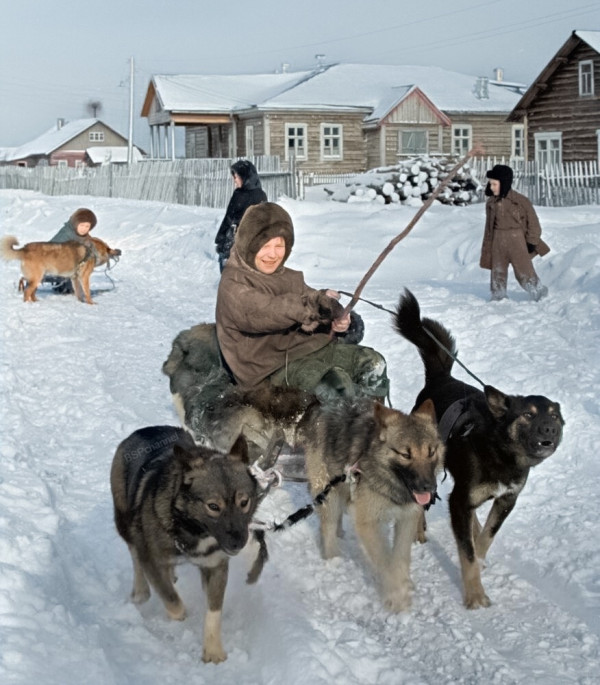 Дети оленеводческого колхоза "Тундра" катаются на собачьих упряжках. Поселок Ловозеро Мурманской области, 1961 год.