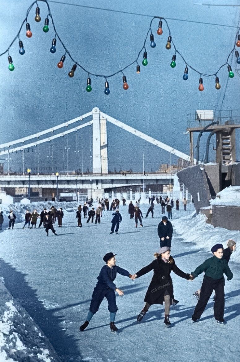 Один из самых знаменитых московских катков расположился в Парке Горького - и с момента своего открытия в 1931 году, ещё при первой директоре парка Бетти Глан, он стал настоящей легендой. Москвичи и гости столицы так полюбили это место, что окрестили парк "фабрикой счастья" - и немалую роль в этом сыграл именно каток. Площадью до 125 тысяч квадратных метров, он был не только одним из крупнейших в Европе, но и самым доступным: прокат коньков стоил копейки, а потому сюда приходили тысячи людей. В пиковые дни на лёд выходило от 15 до 20 тысяч человек одновременно! Даже в суровые военные годы каток не был пустым. Как сообщала газета "Вечерняя Москва" в 1942 году, он оставался открытым - и ежедневно его посещали от трёх до пяти тысяч человек, находивших в движении по льду пусть ненадолго, но передышку от тревог и забот.