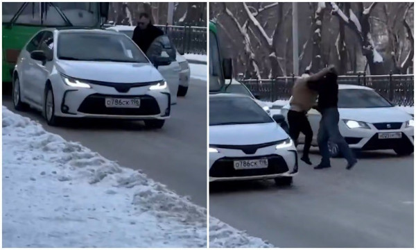 В кулачном бою схлестнулись водитель автобуса Березовский - Екатеринбург и владелец автомобиля "Тойота Королла". Конфликт начался из за того, что легковушка преградила путь к остановке и водитель автобуса вышел с просьбой отогнать автомобиль.