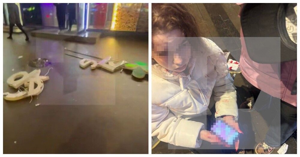 Вывеска продуктового магазина упала вместе с железной арматурой, когда девушка шла под ней. В пострадавшую не попали металлические части конструкции, а лишь пластиковые буквы.