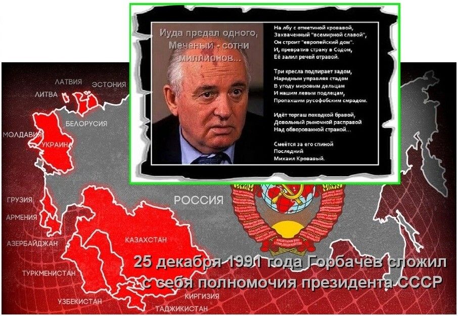На мой взгляд, тогда, 25 декабря 1991 года, Горбачёв, объявив о своей о своём уходе с поста президента СССР, фактически дезертировал, как жалкий трус и предатель, предоставляя 294 миллионам советских граждан спасаться самим, кто как может...Образно говоря, капитан сбежал с тонущего корабля если не первым, то уж точно в первых рядах.......Как нельзя лучше, на мой взгляд, характеризует произошедшие вот эта фраза из кинофильма "Брат-2", которую наверняка помнят многие:"Сдал Горбачев твою Родину американцам, чтоб тусоваться красиво"Горбачёва, в обмен на сдачу СССР, ждала президентская пожизненная пенсия, дача, закреплённый за ним служебный автотранспорт, личная охрана, а также помещение для работы "Горбачёв-фонда".А ещё иуду, предавшего советский народ, ждала любовь европейских политиков, шикарные приёмы, трёхэтажный особняк в Баварских Альпах Германии и прочие радости жизни.....Граждан же брошенного и преданного им Советского государства ждали тяжёлые испытания за своё выживание, которые для многих закончились очень плачевно......Да, уважаемые подписчики, тогда произошло предательство, которое оставило неизгладимые шрамы в душе многих и многих советских людей....И хочу завершить статью вот этими строками короткого стихотворения, которое предаёт всю боль от утраты нашей великой Советской Родины, которая была предательски уничтожена Горбачёвым, Ельциным и другими перерожденцами-предателями из их окружения....