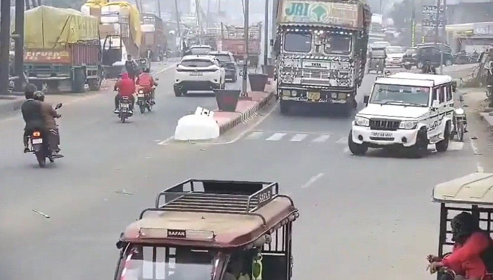 Грузовик "Тата", гружённый шелухой, перевернулся на внедорожник "Махиндра Болеро", в результате чего водитель погиб на месте. Рампур, Индия.