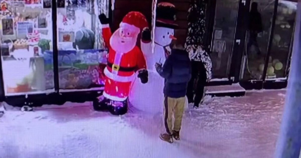 Двое парней похитили надувных Деда Мороза и снеговика, стоявших возле одного из магазинов. Пока один из мужчин отвязывал фигуры, другой стоял на карауле.