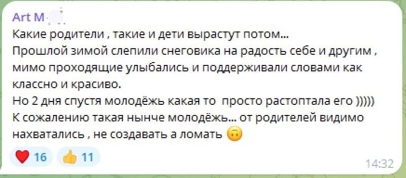 Некрасивая история произошла в ЖК "Изумрудный бор": группа детей строила снежную крепость, когда к ним подошла незнакомка с ребенком и зеленой ледянкой. Сын женщины начал рушить замок, и ему сделали замечание. Услышав это, его мать начала ломать постройку. Увидевшие как на их глазах рушится замок, дети начали плакать. На замечание соседки агрессорша ответила, что дети вправе обратиться в Организацию Объединенных Наций.