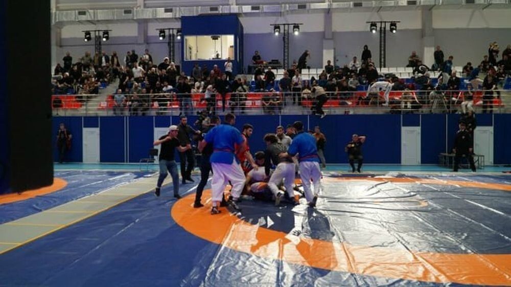На турнире по борьбе один из спортсменов спровоцировал массовую драку. Полицейские, дежурившие на мероприятии, применили дубинки для усмирения конфликтующих сторон.