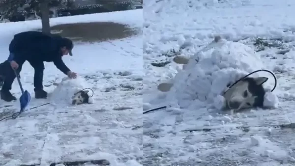 Хозяин решил закопать своего хаски в снегу. Питомец оказался совсем не против подобной шалости.