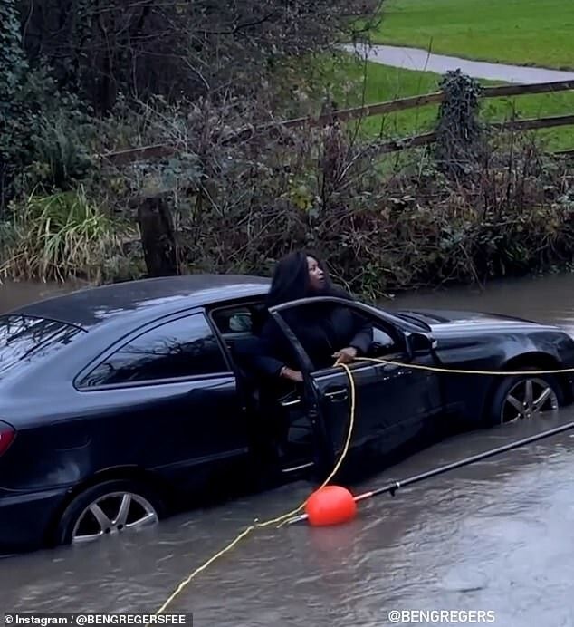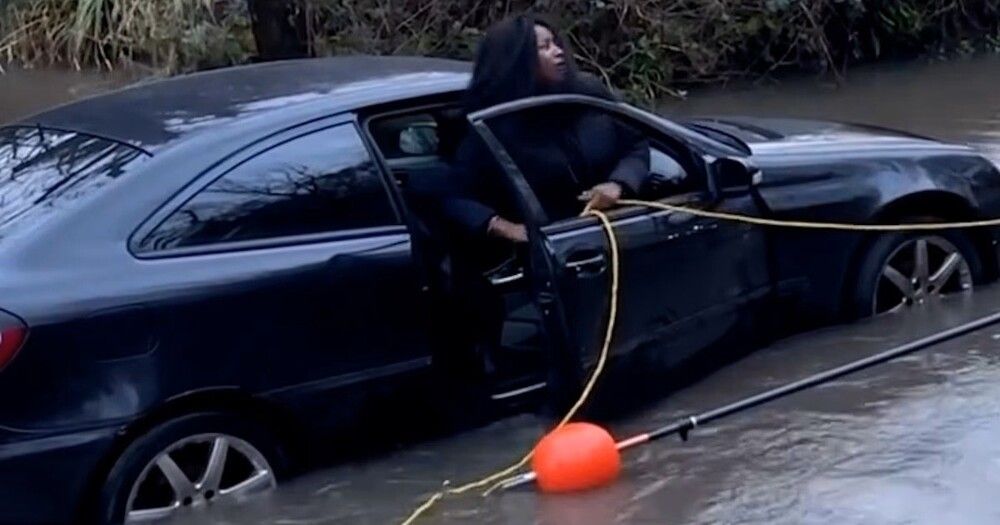 Пожарный бросает "утопающей" верёвку с люминесцентным поплавком, женщина отчаянно цепляется и открывает дверь автомобиля. Оказывается, вода ей чуть ниже колена, и она с лёгкостью выходит на берег.