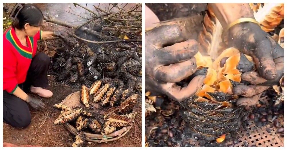 В китайской провинции Юньнань издавна готовят необычный деликатес - жареные шишки сосны чилгоза или гималайского кедра. Целые, нераскрытые шишки бросают прямо в открытый огонь или кладут на раскалённые угли.