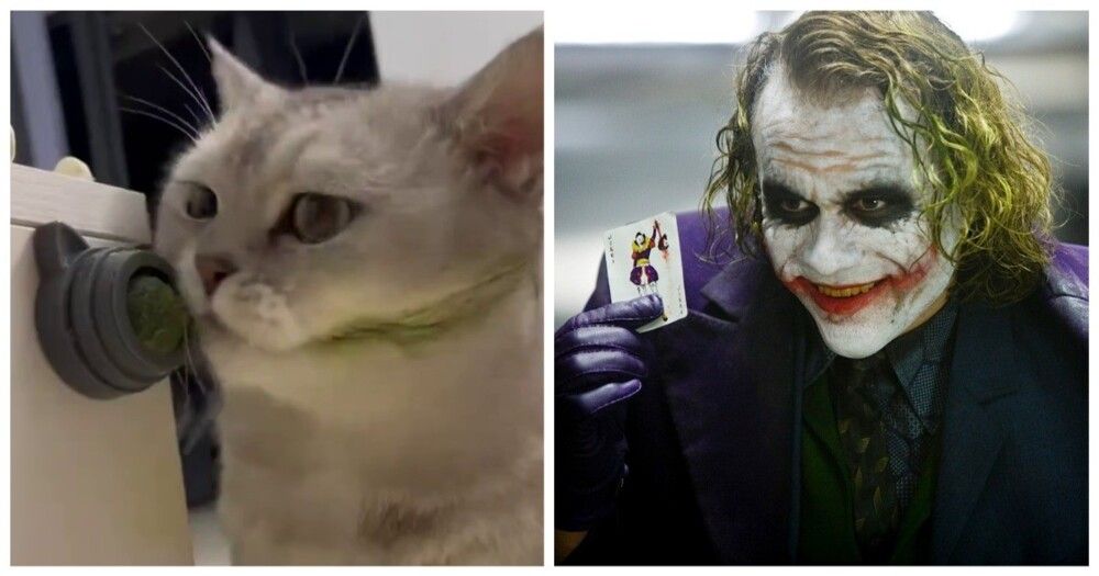 Кот, облизывающий шарик с кошачьей мятой, напомнил пользователям сети террориста Джокера из фильма "Темный рыцарь" 2008 года.