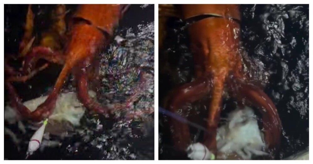 Мужчина запечатлел гигантского кальмара, пытавшегося полакомиться более мелким кальмаром. Разница в размерах впечатляет.