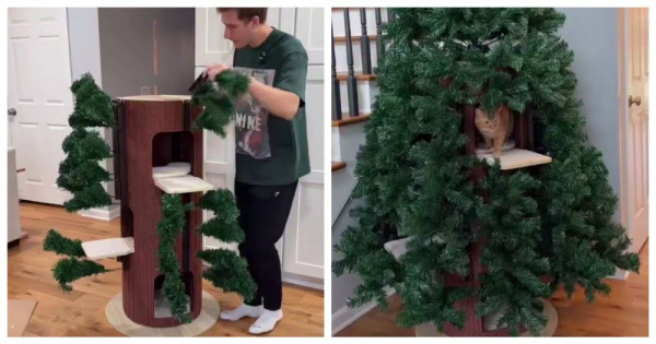 В сети набирает популярность видео с новогодней елкой для котов. Это домик-когтеточка в форме ёлки с искусственными веточками и отсеками, в которых питомцы могут отдохнуть.
