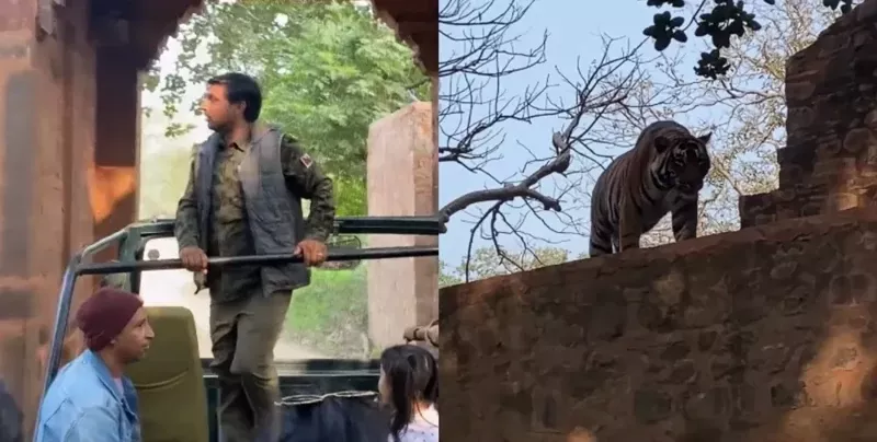 В индийском национальном парке Рантхамбор туристы посещали исторические руины крепостей, когда неожиданно на стене появился тигр. Посетители не были готовы увидеть хищника так близко, что поразило пользователей сети.