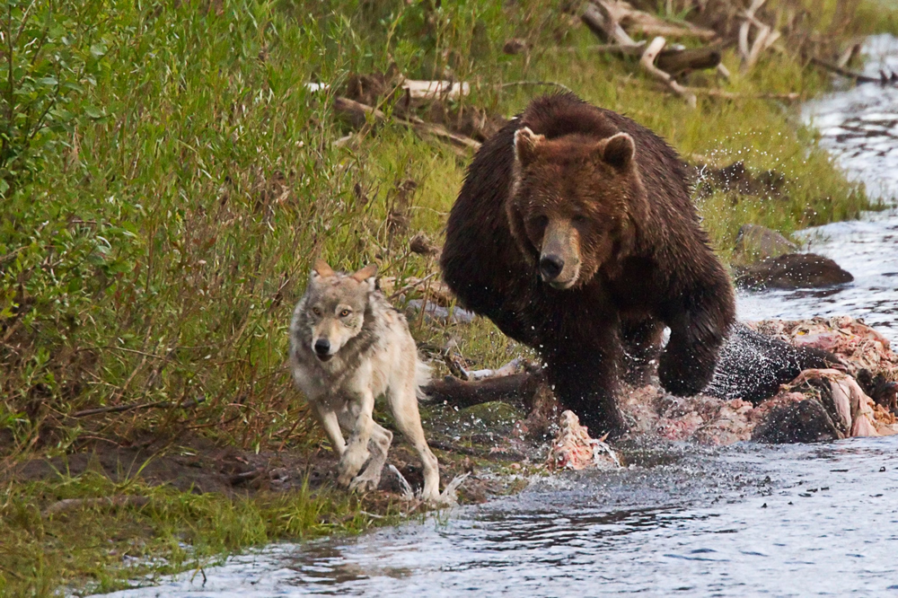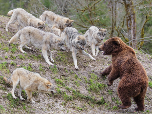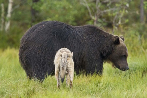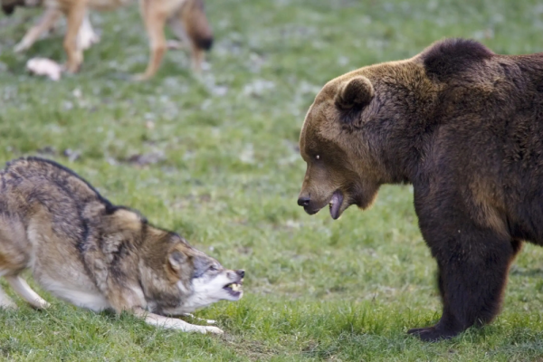 Но если встреча и происходит, то, как правило, её инициаторами становятся медведи. Они приходят на запах свежедобытой туши или даже наблюдают за охотой издалека, выжидая удобного момента. А потом просто появляются, чтобы получить свою долю с добычи. Но даже при таком раскладе никакой кровавой бани не будет. Ведь волки не дураки, и не готовы проливать свою кровь из-за куска мяса. Поэтому обычно никто не дерётся: животины просто устанавливают порядок "кто будет есть первым". Если стая волков малочисленная, от 4 до 8 особей, то, как правило, они оказываются вторыми в очереди.