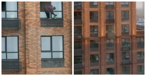 Женщина без страховки мыла окно на большой высоте