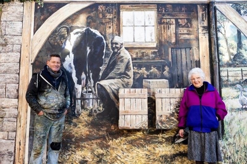 Фреска соседствует с другой, созданной местным художником Джоном Миншаллом восемнадцать месяцев назад. На ней изображён покойный отец Бейкер, Артур Нэпстоун, доящий корову.Бейкер родилась на ферме в Мире, графство Сомерсет, Англия. Сейчас она живёт в уютной пристройке, бывшей когда-то сыроварней. Её сын Дэвид, 68 лет, и его жена Дженни, 64 года, заняли основную часть здания.