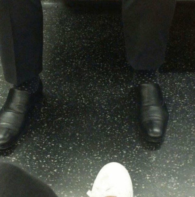 Левитация для начинающихКажется, мы нашли человека-невидимку, который, к сожалению, начал исчезать не целиком, а частями! Глядя на этот кадр, глаза отказываются верить: ботинки стоят, брюки висят, а между ними - зияющая пустота. Вот что значит идеальный камуфляж - в таких носках можно не только слиться с интерьером, но и заставить попутчиков в метро украдкой креститься, глядя на ваши одиноко парящие туфли.