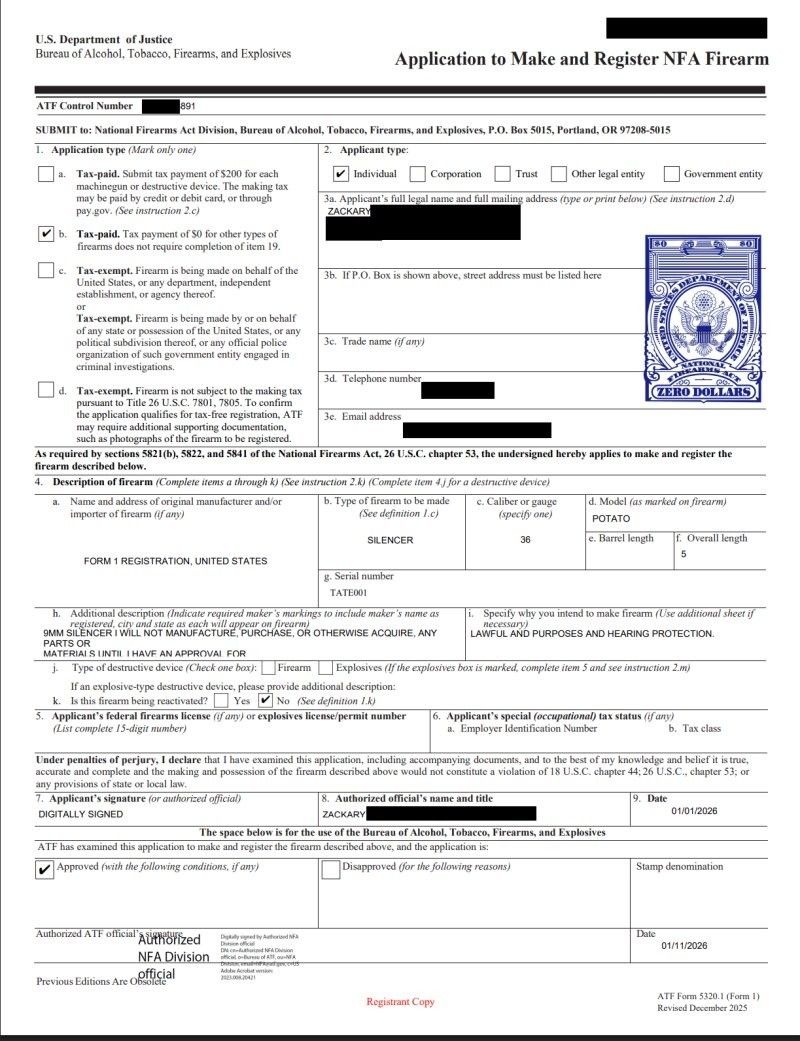 "Большой прекрасный законопроект" (One Big Beautiful Bill) администрации Дональда Трампа, принятый в начале 2026 года, который в том числе затронул закон 1934 года о регулировании отдельных видов оружия (National Firearms Act), дал свои плоды. В виде глушителей из картошки. Всё дело в серьёзном упрощении процедуры регистрации глушителей. Её полностью оцифровали и сделали бесплатной. Раньше для этого необходимо было заплатить 200 долларов в виде налога на юридическое утверждение. Получив такой подарок, американские кулибины и владельцы 3D-принтеров завалили Бюро по контролю за алкоголем, табаком, огнестрельным оружием и взрывчатыми веществами (ATF) своими странными изобретениями. Одним из таких шутников стал Зак Кларк. Он не первый, кто пытался зарегистрировать картофелину в качестве 9мм глушителя, но стал первым, чьё "изобретение" было одобрено ATF.