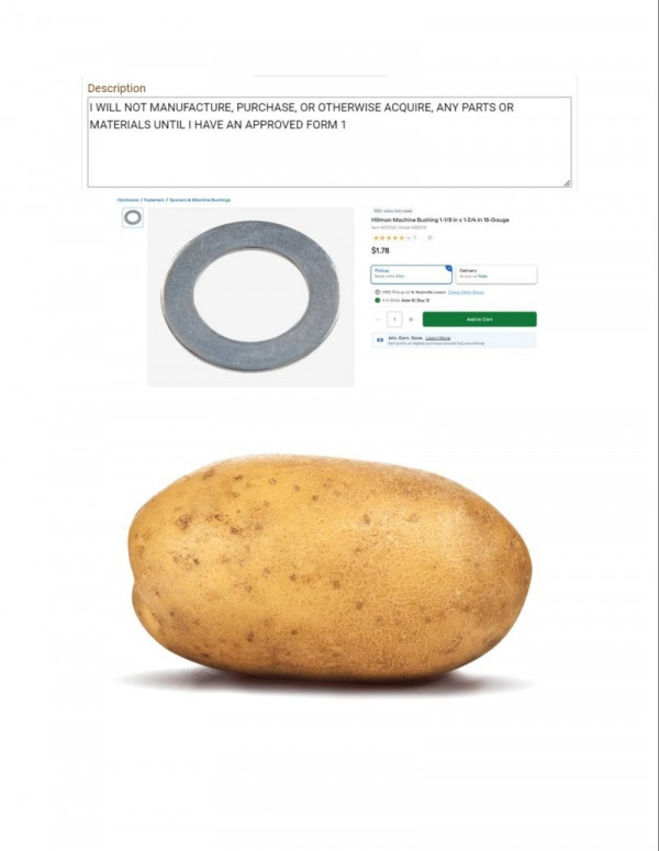Отмечается, что закон о регистрации устройств для подавления звука выстрела предусматривает, что изобретатель сначала должен подать в ATF уведомление о намерении изготовить своё устройство и получить разрешение до начала его производства. Именно это разрешение и получил Кларк. "На данный момент у меня есть серийно пронумерованная шайба, и у меня есть картофель, но я их ещё не собрал вместе. После одобрения существует своего рода производственная пауза - нужно подождать. Плюс возникает целый философский вопрос о намерении изготовления: считается ли началом производства момент, когда ты покупаешь картофель? Или когда в доме вообще есть картофель? А любые картофельные продукты считаются?" - пошутил Кларк.