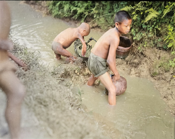 Мальчики занимались традиционной ручной ловлей рыбы в небольших речках и ручьях. Без сетей, без удочек - только сноровка, терпение и простые подручные средства: корзины, ловушки или даже голые руки. Такие сцены были неотъемлемой частью сельской жизни: дети с ранних лет участвовали в обеспечении семьи, а рыбалка становилась одновременно и трудом, и игрой.