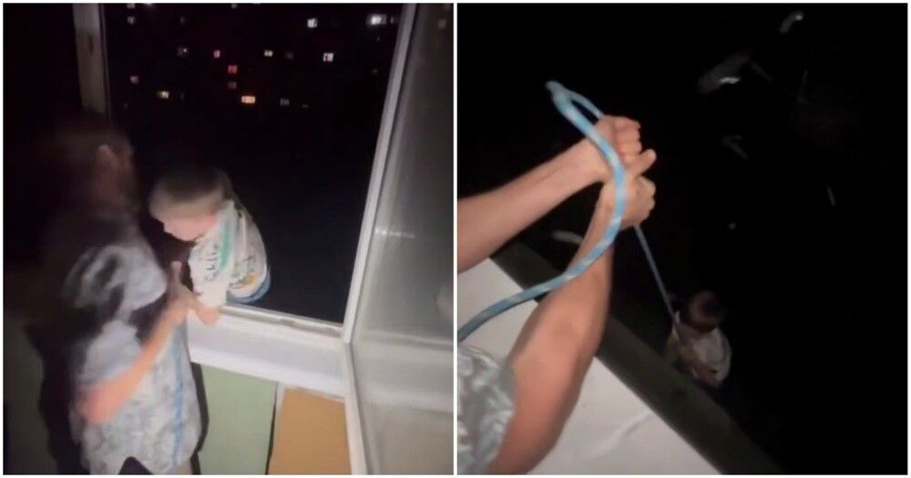 Отец решил устроить сыну экстремальный аттракцион. Мужчина спустил мальчика на тросе с балкона.