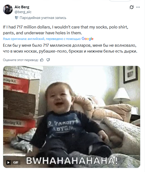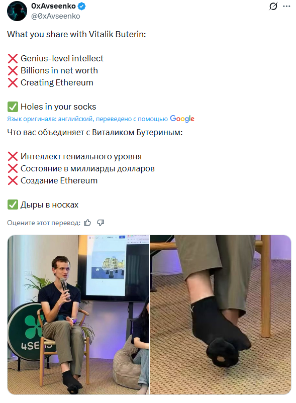 После появления фото с конференции над Бутериным начали подшучивать в интернете. Кто-то называл его миллионером из народа, кто-то шутил, что он тоже в каком-то роде криптомиллионер, а кто-то и вовсе заявил, что гении живут в другом мире и им чужды такие мелочи как тщеславие и забота о внешнем виде. "Учитывая волатильность стоимости криптовалюты Ethereum, даже Виталик Бутерин не может позволить себе новые носки", - пошутил один из пользователей соцсети X.