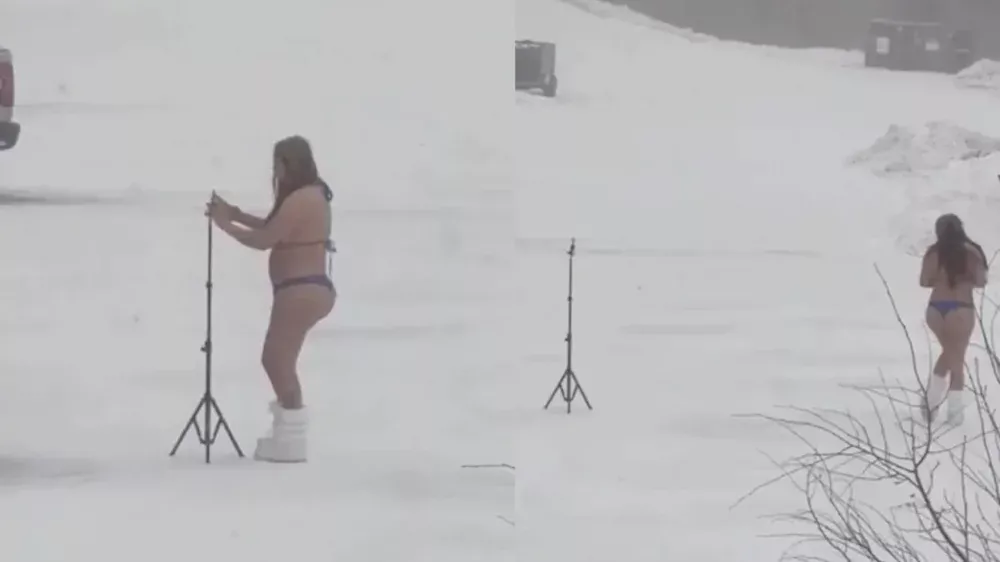 Девушка демонстрирует работу над контентом в суровых погодных условиях, показывая, что не все съёмки проходят в тёплых условиях и что для привлечения внимания иногда приходится терпеть неудобства