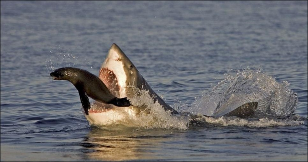 Прямой контакт же обеспечит пасть. Те самые знаменитые челюсти смыкаются с силой 18 000 Ньютонов. Это сила гидравлического пресса. Прибавьте к этому несколько рядов зубов - их у белой акулы около 300 - и получится живой капкан! Белая акула не хватает добычу. Она отрывает от неё куски.