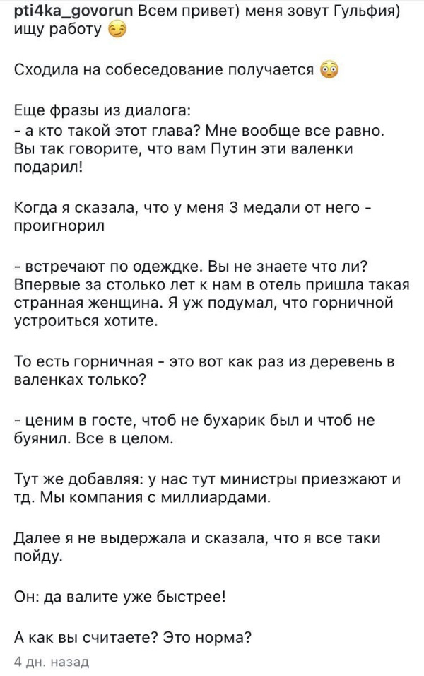 Управляющий, который проводил собеседование, оказался хамом. Девушка пришла в валенках и получила комментарий про глухую деревню и ещё множество мерзких замечаний.А за валенки обидно, конечно...