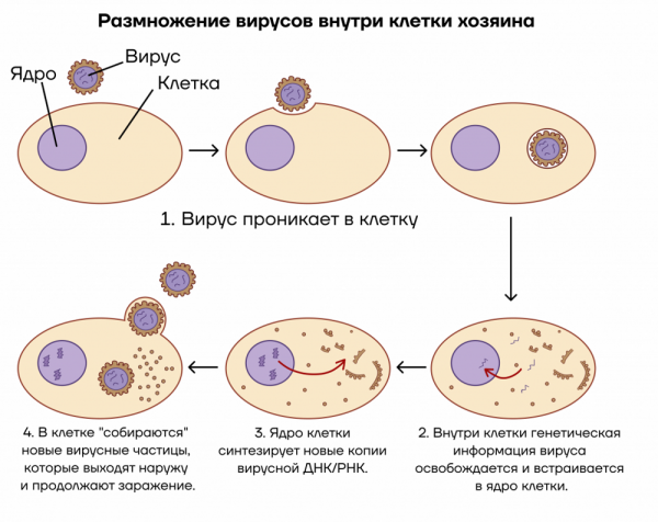 У всех клеток нашего организма есть оболочка, на которой расположены рецепторы. С их помощью клетки общаются друг с другом, получают питание и выводят продукты обмена веществ. Этакие двери на замке, чтобы ничего лишнего не попало внутрь и не вышло наружу. У вирусов тоже есть рецепторы - ими он тыкается во все клетки подряд - на удачу. Иногда им везёт, и ключ-рецептор на вирусе совпадает с дверью-рецептором на клетке. Если такое происходит, клетка сама затаскивает вирус внутрь, предполагая, что если есть совпадение по рецепторам, то это обязательно что-то нужное. Забравшись в клетку организма-хозяина, вирус подсовывает ей свой фрагмент генетической информации, как инструкцию к действию. Вместо того, чтобы заниматься своими делами, она бесконечно тратит свои ресурсы на создание новых копий попавшего в неё вируса. Со временем они выходят из клетки, снова попадают в организм, и цикл повторяется. То есть вирус даже не размножается сам, он просто обманывает клетку и заставляет её становиться своей личной фабрикой.