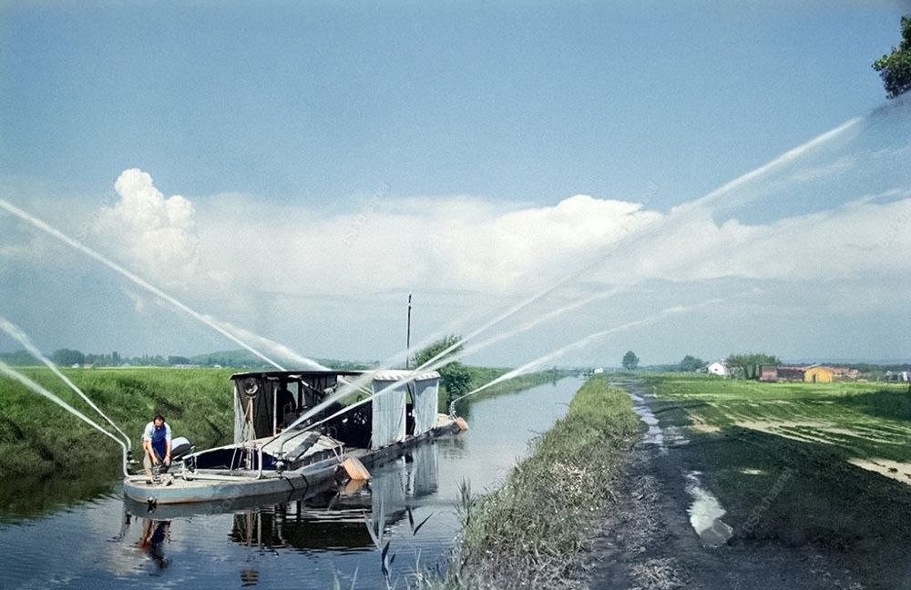 Ирригационный катер поливает растения в огороде государственного сельскохозяйственного кооператива "Балатоннадьберек", откуда большое количество овощей доставляется на курорты озера Балатон. Венгрия, 1957 год.