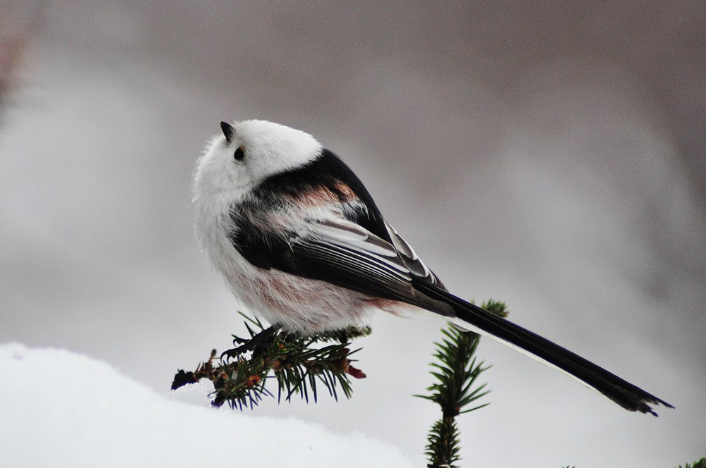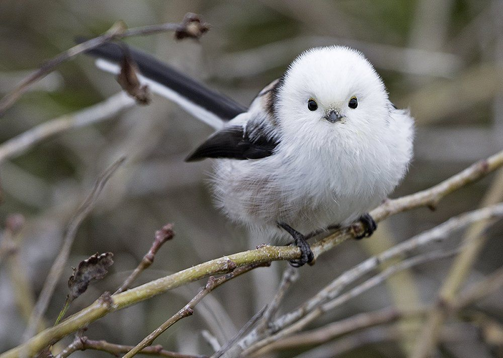 Это не кусочек сахарной ваты, это птичка, которую вы можете увидеть за окном. Знакомьтесь, длиннохвостая синица. Пожалуй, самый милый пернатый наших краёв!