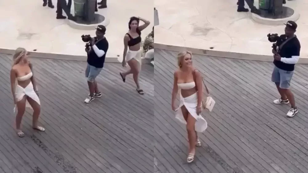 Мужчина фотографировал девушку на улице, пока та позировала и кокетничала перед камерой. Во время съёмки она случайно задела прохожую, которая шла завтракать. В результате столкновения еда выпала из рук и оказалась на земле.