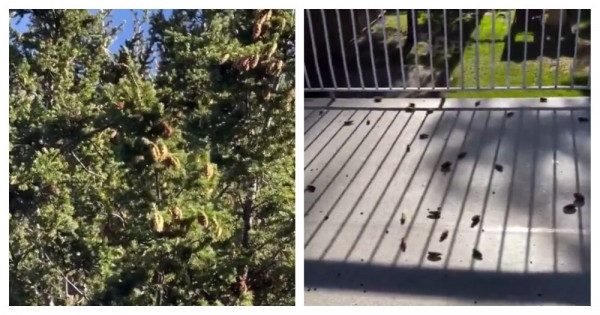 Женщина услышала странные звуки за окном. Выйдя из дома она обнаружила белку, скидывающую шишки с дерева.