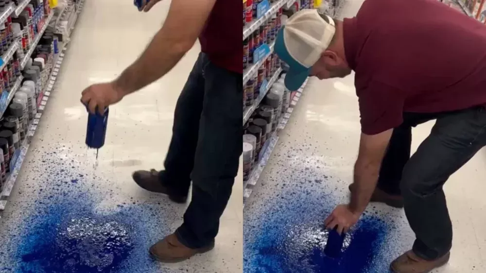 Мужчины сняли на видео забавный инцидент в магазине, где баллончик с краской дал трещину и начал распылять содержимое. В результате краска покрыла прилавки, товары, а также лица и руки самих авторов ролика.