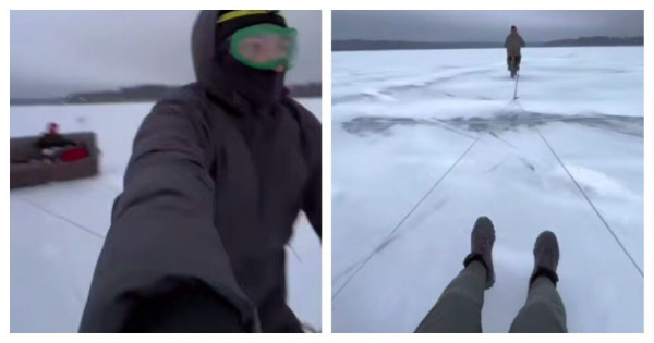 В подмосковном Солнечногорске любители острых ощущений привязали диван к электробайку и прокатились по замерзшему озеру.